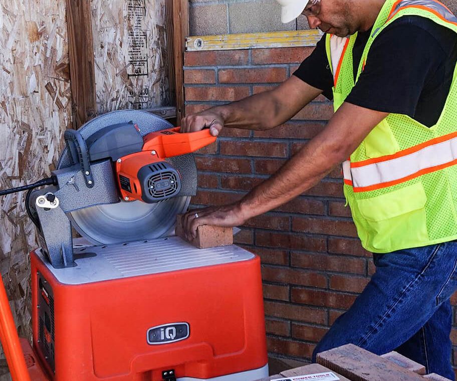 集塵装置内蔵レンガ乾式切断機 iQ360X 作業場での切削粉を驚くほどシャットアウト!集塵率99%。移動もラクラク 耐火煉瓦(SK36程度まで)、赤レンガ、インターロッキング等の切断に! ■本体寸法: 510x430x790mm 30kg ■カットモーター: 単相100V 1400W 50/60Hz 3500rpm ■集塵モーター: 800/600W(50/60HZ) 風量92CFM ※本体への電源は1箇所です ■総電流: 20A (カットモーター15A、集塵モーター5A) ■脱着式スライドテーブル&直線補助ガイド付き ■使用ブレード径: 14インチ(Φ355mm) 軸径25.4mm ■付属刃: 14インチターボリム(SK36までの耐火煉瓦、赤レンガ、インターロッキング等切断可) ■ 最大切断厚: 110mm(スライドテーブル使用時は最大90mm) ■最大切断長: 280mm ■米国 IQ POWER TOOLS 社製 PDFカタログ